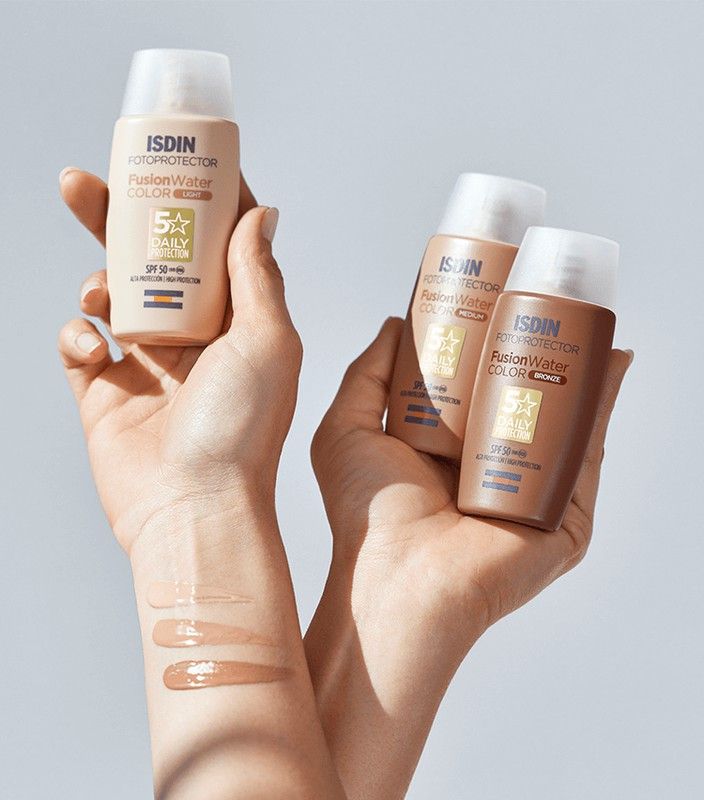3 tonos distintos de color Solar Isdin Innovación Safe Eye Tech No pica los ojos Protección con un toque de color Protector solar de uso diario y para actividades al aire libre Protección solar ultraligera y de uso diario que además de garantizar una alta protección frente a la radiación UVA aporta hidratación intensa y absorción inmediata. No comedogénico. Oil-free. Hipoalergénico. Alta protección SPF 50 evaluada clínicamente en laboratorio y en condiciones reales de alta radiación solar. Hidrata en profundidad gracias a su fórmula con ácido hialurónico
